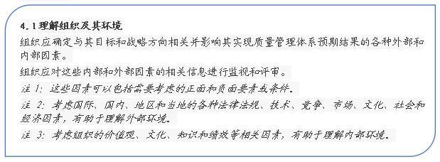 “組織及其環境”,是ISO9001:2015標準新增的要求,強調質量管理體系應充分適應組織自身情況和其面臨的內外部環境狀況,組織的質量管理體系的調整與變化應基于內外部環境的變化;組織的戰略定位、戰略規劃的調整也應充分考慮內外部環境的變化。