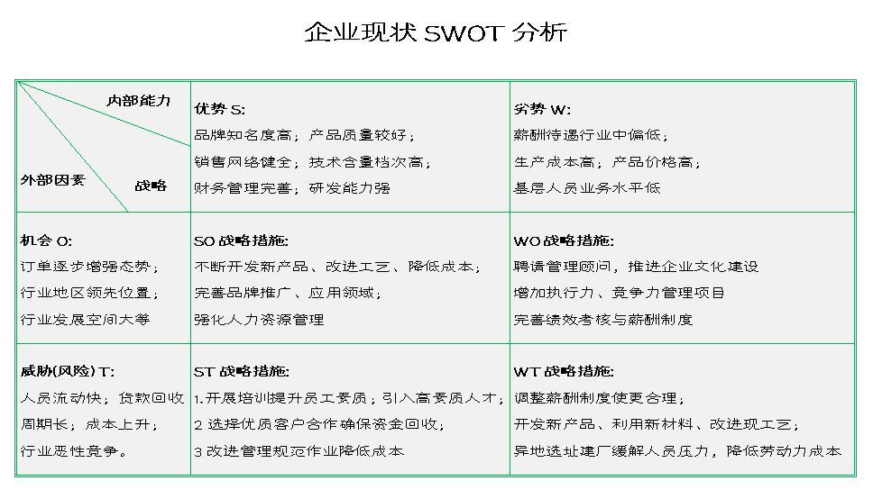 由于企業是一個整體,所以在做優劣勢分析時必須從整個價值鏈的每個環節上,將企業與競爭對手做詳細的對比。如產品的實用性、新穎性,制造工藝成熟度與復雜性、銷售與服務渠道是否暢通,及價格是否有競爭性等。如果企業在某一方面或幾個方面的優勢正是行業內企業應具備的關鍵、成功要素,那么,企業的綜合競爭優勢也許就強一些。需注意的是,衡量一個企業及其產品是否具有競爭優勢,只能站在現有潛在用戶的角度上,而不是站在企業的角度上。