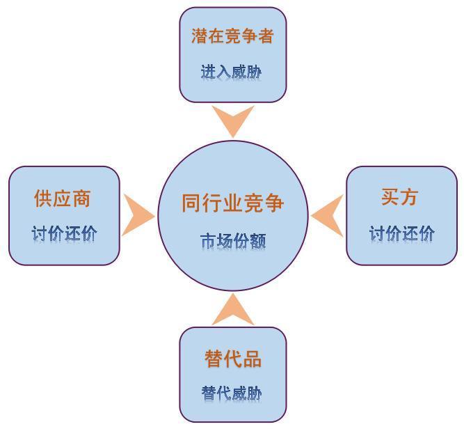 一般用于外部競爭環境的分析。一般來說,行業中存在著決定競爭規模和程度的五種力量,分別為(1)同行業內現有競爭者的競爭能力、(2)潛在競爭者進入的能力、(3)替代品的替代能力、(4)供應商的討價還價能力、(5)購買者的討價還價能力。